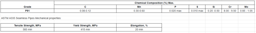 UK Steels is a recognized manufacturer and exporter of ASTM A335 Alloy Steel Gr P91 Seamless Pipes, which is stringently tested on various parameters of quality. To meet the specific need of the clients, our professionals can customize these ASME SA 335 Pipes. Continuous use in 425 Degree C – 860 Degree C range not recommended for these Alloy Steel Seamless Pipe due to carbide precipitation, if subsequent aqueous corrosion resistance is needed, but often performs well in temperatures fluctuating above and below this range. Our Grade P91 Seamless Pipe are available in numerous specifications that meet on clientele demand. These Alloy Steel ASTM A335 Gr P91 Seamless Pipe are manufactured with high-grade raw materials obtained from the finest experts in the industry. Our P91 Alloy Steel Seamless Pipe are made from finest quality of high strength stainless steel materials designed into very durable and convenient to use the product.